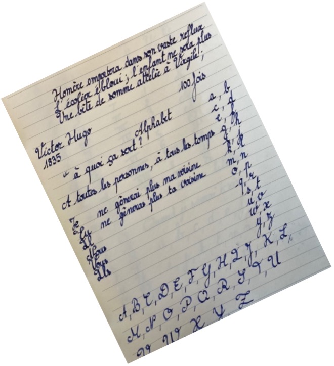 La langue tirée, toute l’attention penchée sur le cahier « Seyès », instrument de torture génialement conçu à Pontoise en 1892, par un libraire-papetier éponyme ; Jean-Alexandre, de son prénom.