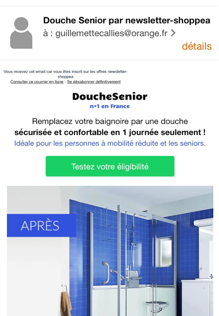 Grâce à une multiplicité d’informations collectées sur vous, dont ne sait d’où et par qui, à partir d’une date précise, celle où l’on a décrété que vous entriez sur la pente déclinante de la vieillesse, cinquante ans en l’occurrence, votre messagerie, vos pages de réseaux sociaux abondent de réclames sur des équipements, tous plus aguichants les uns que les autres : monte-escalier, douche aménagée, pince télescopique, protections anti-fuites urinaires. Sans oublier les images évocatrices de somptueuses conventions-obsèques.