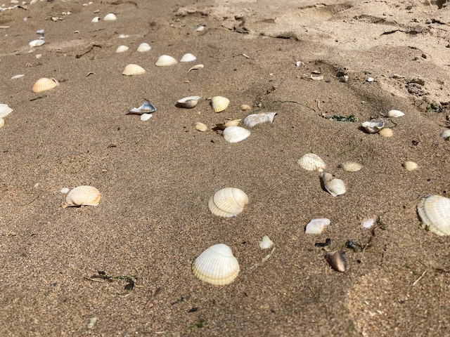 Les coquillages marquent l’avancée invasive des marées, une bande presque parfaitement rectiligne, un trésor de guerre dans lequel il suffit de puiser. Il faut se dresser, quitter son séant confortable et se mettre en quête, l’œil à l’affût, de l’exemplaire rare ; celui que l’on n’a pas encore. Trophées d’une déambulation sans objet, sans but, presque innée, les coquillages s’offrent en déballage tout au long de la plage.  Le sable, jaloux, tente d’en dissimuler les plus beaux spécimens ; le regard pointilleux les décèle au moindre indice : une couleur, une forme, une polissure.