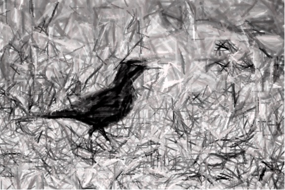 Le merle siffle l’envahissement humain, le merle flûte à l’embrasement solaire des aurores dorées, le merle appelle sa dulcinée de toute la puissance de ses notes, le merle babille avec ses semblables pour disputer son territoire, prévenir d’un danger, signaler, peut-être un festin de miettes ou de vermisseaux dodus.