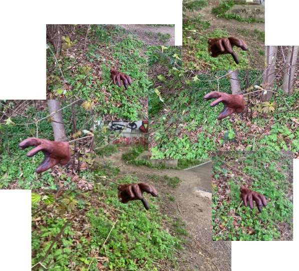 Au bord du chemin, suspendue dans les airs, la main menaçante d’un fantôme criminel s’élance à la rencontre de sa proie. Elle heurte de face le regard flou du passant tout à son effort ou tout à sa rêverie. Bras invisible, manchot à la recherche de sa moitié manquante, spectre surpris par le jour ; toutes sortes de scénarios sont possibles.