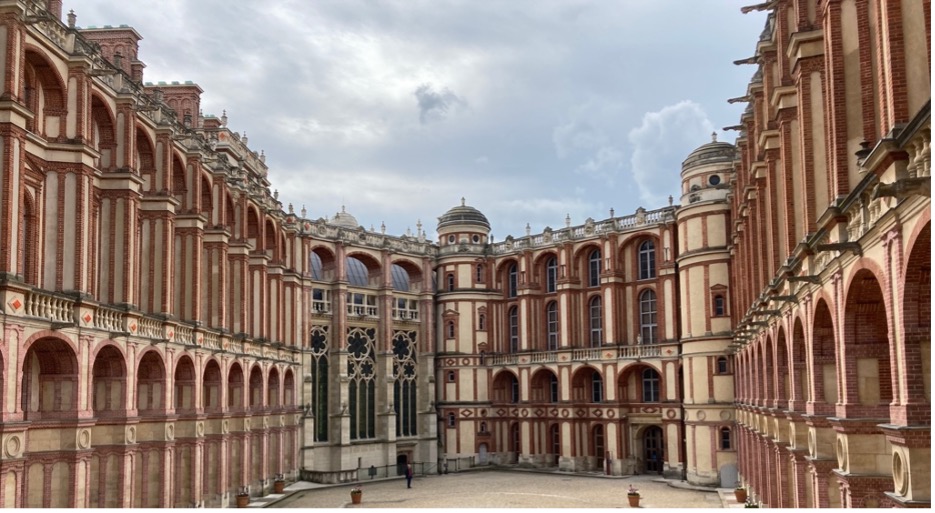 « Saint-Germain est le château dont le prince est un enfant. » Ainsi le docteur Héroard, médecin ordinaire du Dauphin Louis XIII, résumait-il dans son Journal, la vie au Château-Vieux de la forêt de Laye. En effet, la plupart des enfants royaux, Henri II, Charles IX, Louis XIV y sont nés et, ou, y ont été élevés ; en partie pour échapper à l’air pestilentiel du Paris de l’époque et aux intrigues du Louvre. Prendre pied dans la cour intérieure transporte dans un décor étonnant. L’usage de la brique comme feston des grandes lignes du bâtiment pentagonal, le contraste de sa couleur avec celle de l’architecture environnante, à commencer par le donjon de Louis VI le Gros et la Sainte Chapelle de Louis IX, la vivacité de cet ocre opposée à un terne ciel nuageux, pousse une impression de décor de théâtre. Le visiteur ne serait pas surpris de voir apparaître des comédiens, des chanteurs, des bateleurs. Mais il s’agit avant tout d’un théâtre royal.