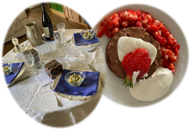 Petite entrée printanière, gigot crouté à souhait, jus généreux et goûteux, pommes de terre moelleuses, Pic Saint Loup profond, fromages à point, dessert généreux mêlant la puissance du chocolat fondant, l’acidulé des premières fraises et l’onctuosité d’une Chantilly fraîche. Œufs de Pâques posés en offrande au coin du verre à pied et cadeau surprise qui attend son cri de joie. Parler de tout et de rien, passer du coq à l’âne, anecdotes et commentaires, éloquence et silence. Clin d’œil, serrements de mains et baisers maternels.