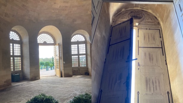 Au bénéfice d’entretiens encore en cours, l’accès à l’Orangerie a été rendu possible et la surprise a été de taille. Taille est bien le mot tant la superficie de cet abri pour les arbres fruitiers et autres essences exotiques est démesurée. Démesurée et épurée : blancheur de la pierre récemment restaurée, lumière filtrée, tamisée par des baies à petits carreaux qui conservent au lieu sa majesté. Le bruit cristallin du filet d’eau alimentant un puit carré au seuil de ce temple horticole résonnait doucement contre les parois voûtées. Une armée entière aurait pu y siéger sans se piétiner. Quelques statues de marbres, dispersées ici-et-là, dialoguaient en politesses muettes. Dans cette pièce, sans doute plus qu’ailleurs dans ce château, on se trouve doublement aux Portes du Soleil, ce Roi admirable à tant d’égards, qui a su faire de son règne une lumière pour les siècles après lui. Donner tant de lustre à une simple serre d’hiver, la concevoir ouverte sur des jardins somptueux, c’est montrer son souci du fragile et du détail, c’est concevoir l’ingéniosité humaine comme une tension vers la perfection.