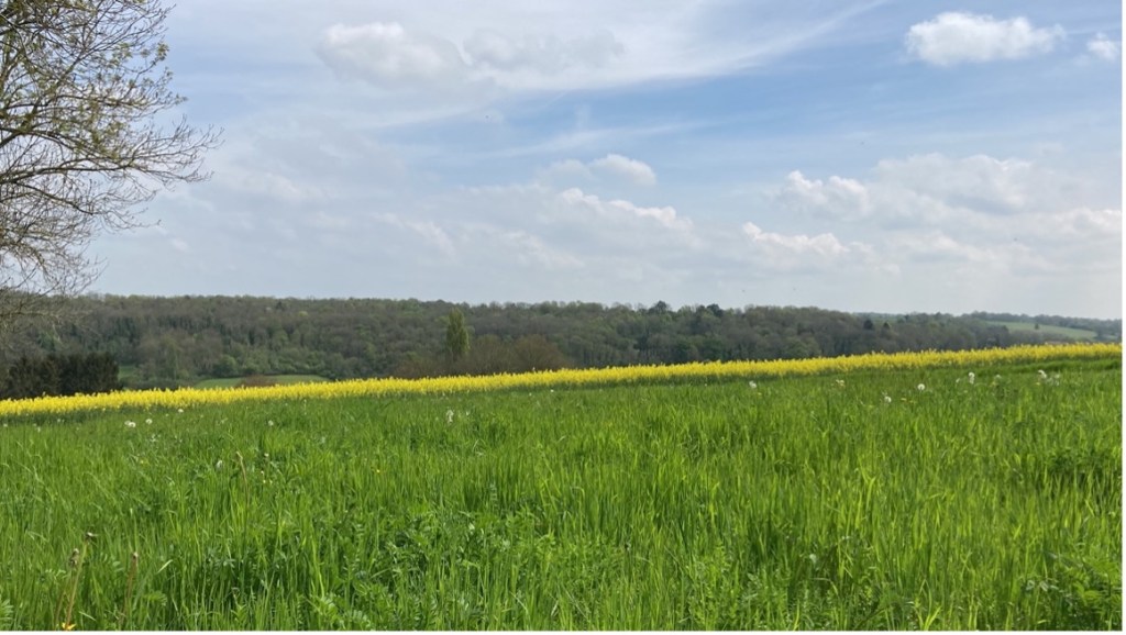 Quelques kilomètres de Paris, le monde change, le monde s’ouvre. Rien ne contrarie le regard ; le printemps, en plein épanouissement, enchante le tableau. Dans un sentier creux, le paysage joue de coquetterie, il borde la soie sauvage de ses prairies céladon de rubans dorés, tissés de fleurs de colza qui ondulent mollement sous la caresse légère du vent. Soie, étoffe précieuse mouchetée d’aigrettes éthérées. Celles-ci n’attendent que le souffle taquin du promeneur pour s’égayer aux quatre points. Ici en ruban, plus loin en débauche d’étoffes immenses, les champs déploient de l’or à l’horizon. Des parfums chauds, sucrés comme du miel, accompagnent le pas. Le gazouillis de tout un orchestre de piafs invisibles est animé, comme le ferait un soliste, par l’appel amoureux d’un coucou, tout aussi indécelable. L’air, encore indécis à cette heure matutinale, mêle subtilement la fraîcheur résiduelle de la nuit et la chaleur timide des premiers rayons de soleil. Il ne faut plus que glisser dans cette prose, rimer avec elle d’une allure discrète et pieuse.