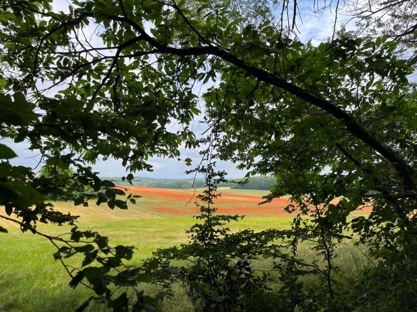 C’est le paysage qui fait la randonnée. Lorsqu’il fait chaud, voire que le ciel poursuit le marcheur de ses menaces d’orage, et que de fait, sa foulée lui coûte un peu plus qu’il ne serait souhaitable, son regard parcourt avec avidité chaque parcelle de son champ de vision et, soit attend le signe, soit attend l’aubaine. Cela ressemble à de l’appétit : une faim qui, malgré ses sommations, sait attendre l’arrivée d’un met délicat plutôt que de fondre sur la pitance. À l’embouchure d’un longue sente en sous-bois, comme une délivrance après une navigation devenue morose, alors que le pas traîne sa fatigue et que le corps résiste un peu, s’ouvre une nappe écarlate, un banc de pavots sang surnageant une mer de blés verts. Le vent joue les courants et contre-courants, l’horizon ondule doucement. Tous les trésors ne figurent pas toujours sur les cartes, mais souvent simplement au détour du chemin.