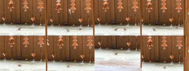 Les valises sont bouclées. Elles sont déjà dans le coffre. La maison est rangée. Plus de souliers de randonnée en attente. Les cartes sont repliées. Aucun pique-nique à emballer, de gourde à remplir ni de sac à dos à vérifier. Il ne reste plus que le lave-vaisselle à vider. Il ronronne, là-bas, dans le fond de la maison. Par la fenêtre un rideau d’un style presque oublié s’est installé : celui de pluie. Ses traits verticaux liquides se succèdent, jouant un motif régulier sur fond de brume dense, d’un blanc cotonneux. Il n’y a pas de perspective, tout l’horizon est pris dans le nuage. C’est ainsi que s’impose la météo en montagne. Pour tromper l’ennui, il suffit de disperser des miettes pour attirer quelques moineaux, autant affamés qu’audacieux. C’est un joli ballet qui se joue : un éclaireur sautille, d’abord loin de la pitance, méfiant, attentif au moindre évènement. Rassuré, il s’approche du buffet et picore avec vivacité. Encouragés, deux puis trois autres s’approchent, se posant d’abord dans les dentelles des garde-corps du bacon. Un rien les fait fuir. Mais, ils reviennent toujours, jusqu’à épuisement du festin. Voilà, la machine a fini sa mission. Il n’y a plus rien à faire, que fermer les persiennes, tirer la porte et donner deux tours. On a beau être adulte, rempli de raison, la fin des vacances est toujours un deuil, celui de l’insouciance. La pluie a joué son rôle ; les vacances sont bien finies. Les piafs, pour quelques miettes, ont joué leur meilleur rôle, celui de poser pour la dernière carte postale à emporter en souvenir. Grâce à eux, se résigner fut moins âpre :