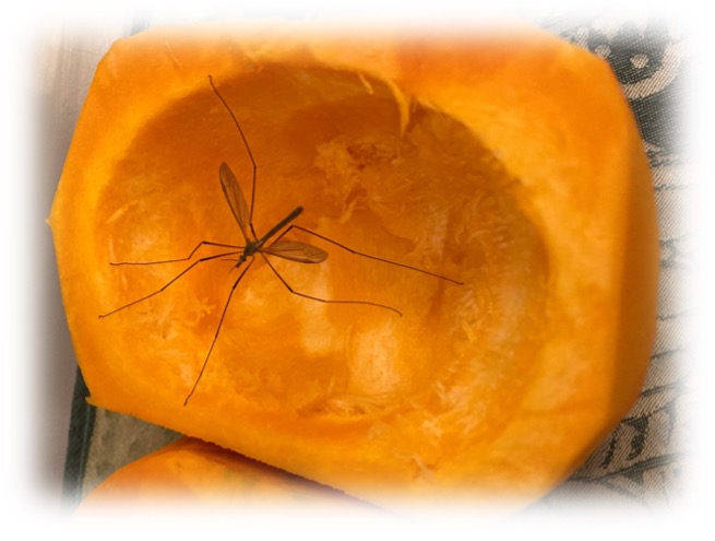 Quelques secondes à admirer une mouche-faucheux. Ou une tipula paludosa, si l’on veut se rengorger de latin scientifique. C’est un diptère à très, très, longues pattes qui, contrairement à son lointain parent le moustique, ne fait aucun mal ; du moins à l’homme. D’un léger coup de spatule en bois, je l’ai envoyée se poser ailleurs, mais elle en avait décidé autrement. Aussitôt chassée, aussitôt reposée : l’étalage de légumes lui offrant l’aubaine d’un repas complet. Il lui faut aussi trouver un abri pour se protéger des premiers frimas.