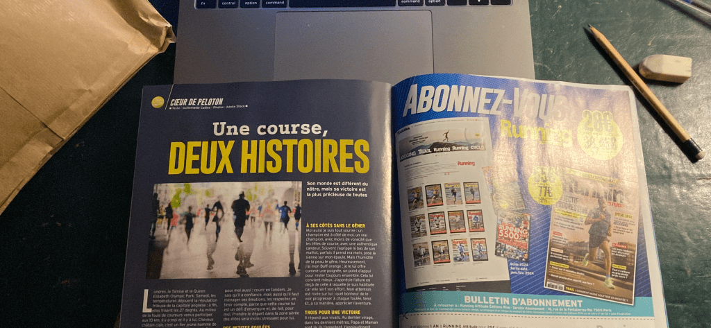Ce n’est sans doute pas sans raison que ce soit un magazine spécialisé dans la course à pied qui m’offre cette visibilité ; ce sport est la cristallisation de la pugnacité, de la résolution. Ce sport récompense chaque tentative, chaque investissement ; il ne soustrait pas, il additionne. Sans doute écris-je comme on court, sans besoin de ballon à faire rouler ou de record à battre ; quand même, se lire sur papier glacé produit, sans doute, un aussi bon effet que des vivats. Mais comme on court au hasard, on écrit au hasard, sans toujours chercher, et presque jamais, atteindre le succès.